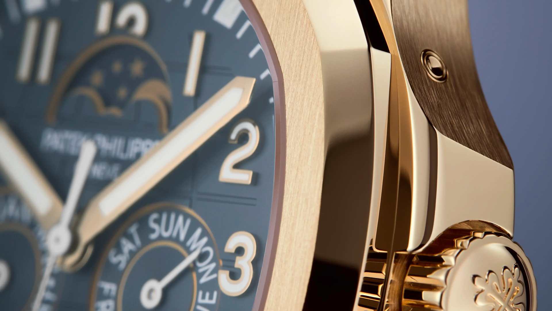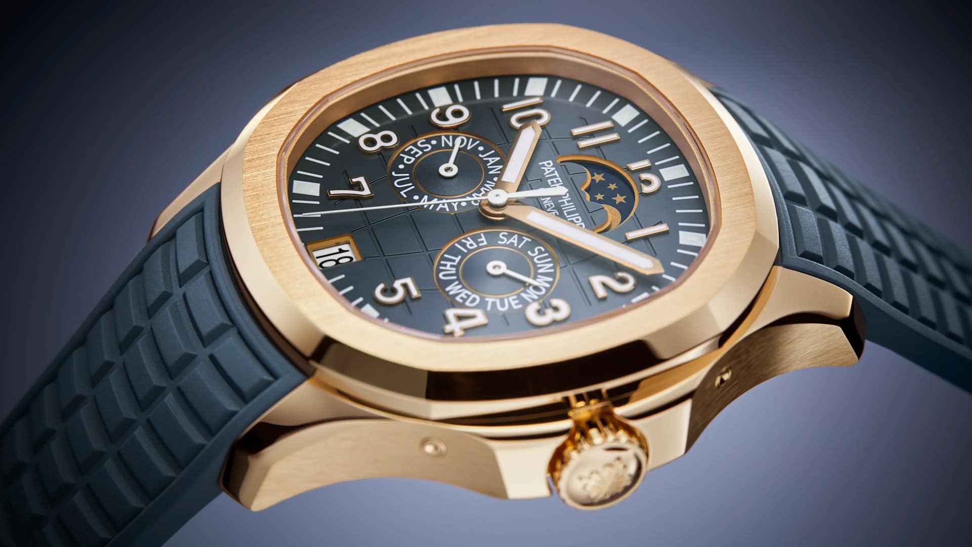 The first Annual Calendar in the Aquanaut collection (2023), this self-winding rose gold model features a complete day/date/month calendar requiring only one manual correction per year, at the end of February. The "contemporary sporty chic" style is accentuated by the blue-gray color of the dial and the strap with its embossed Aquanaut motif.