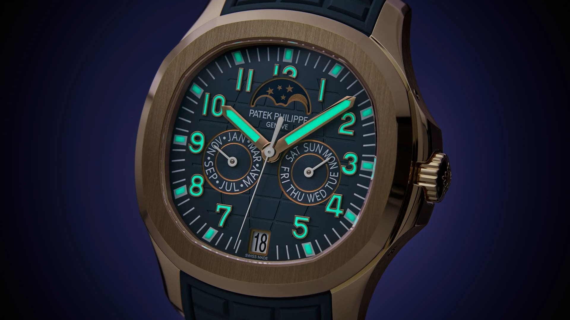 Blue-gray dial embossed with Aquanaut pattern. Rose gold applied numerals and baton-style hands, all with white luminescent coating.