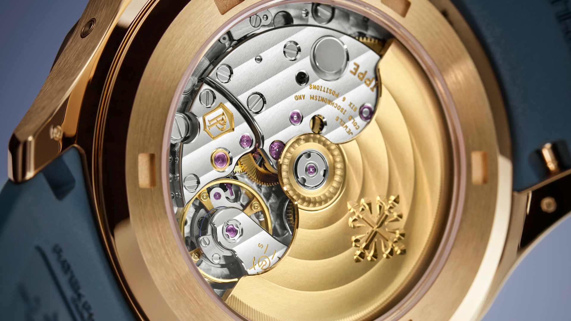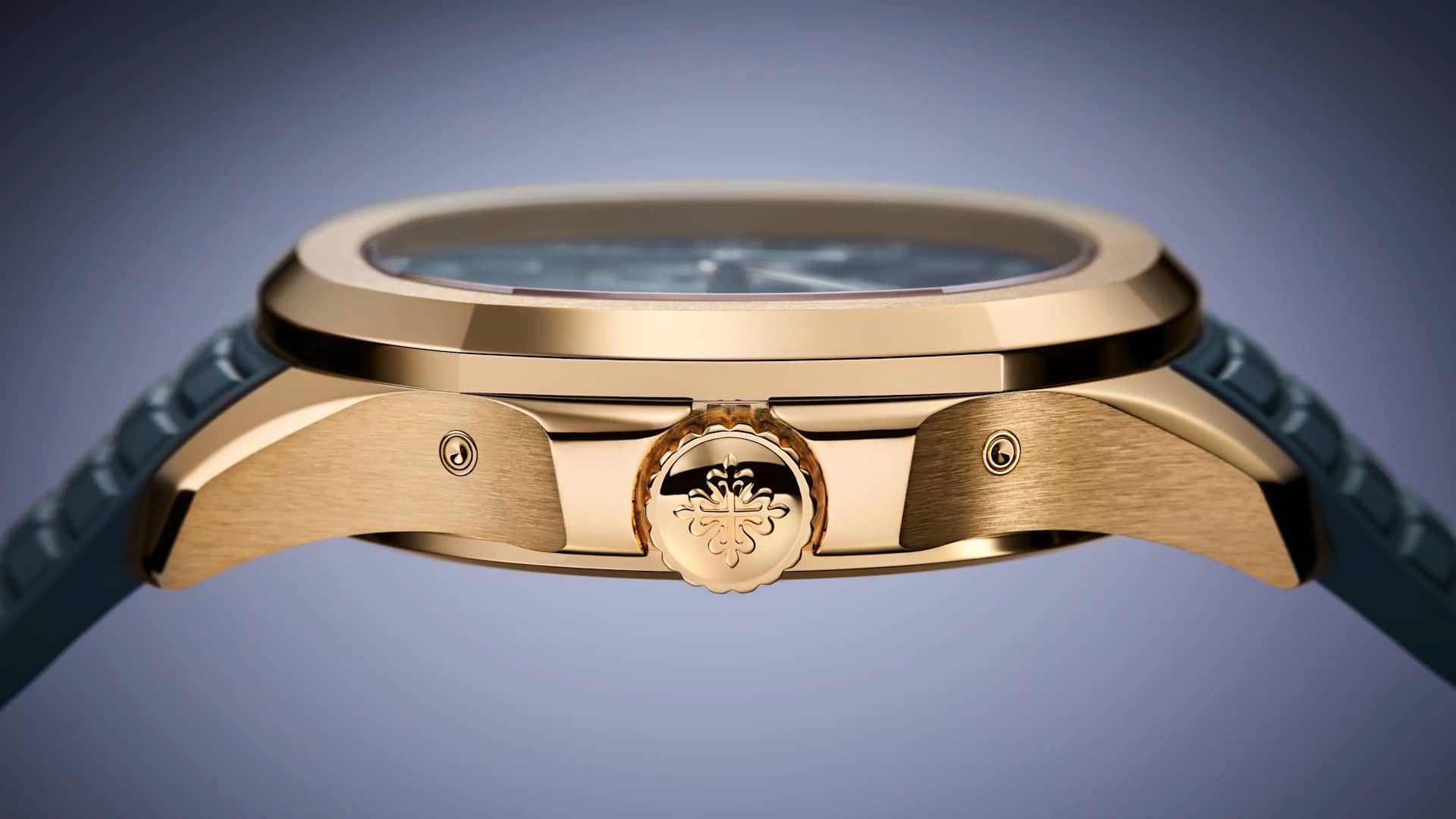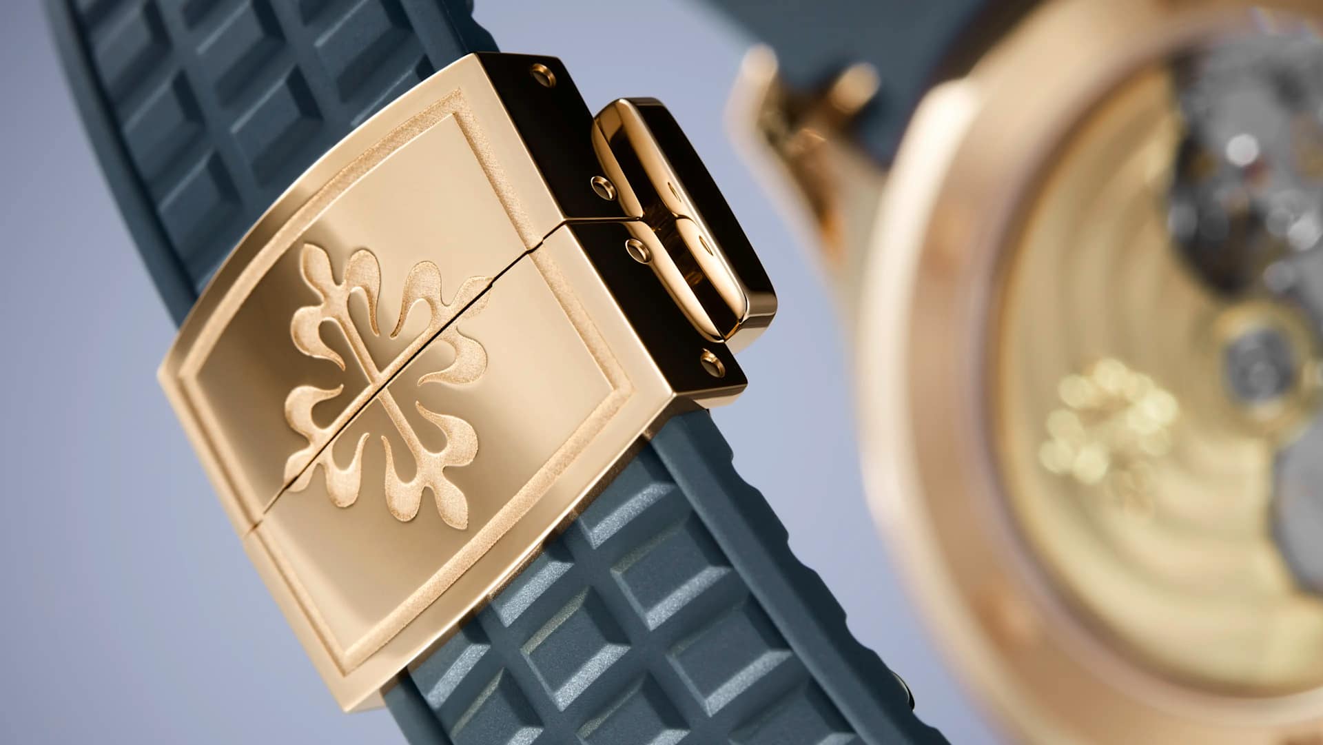 Integrated blue-gray composite strap with Aquanaut pattern and patented rose gold fold-over