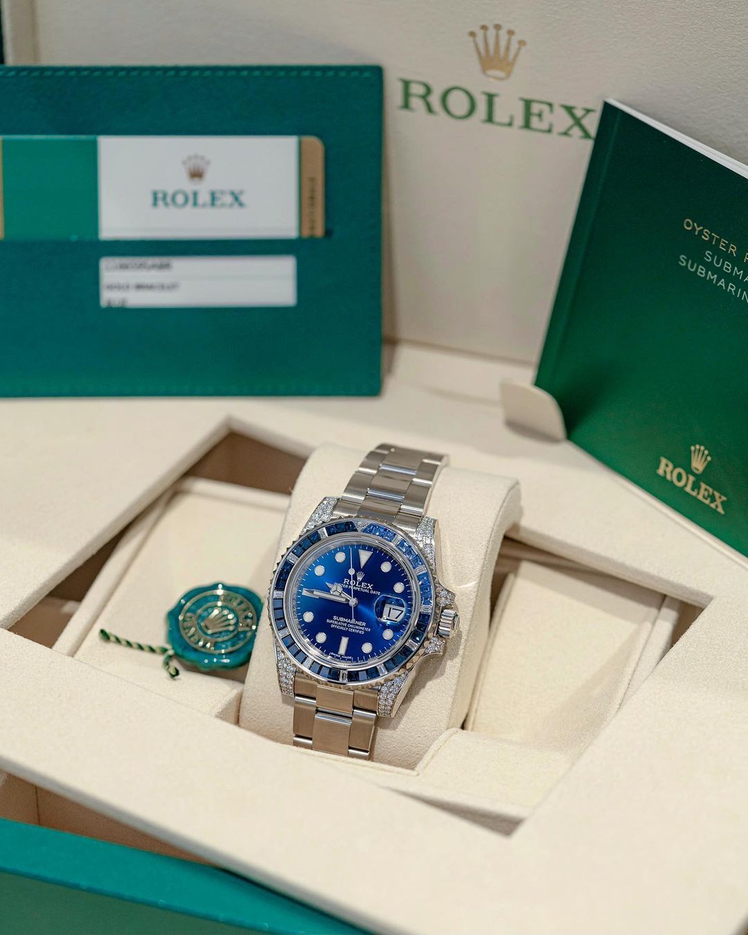 Diamond Rolex Submariner Date Ref. 116659SABR is presented at Baselworld 2018 and immediately attracted much attention. The bezel of the extremely rare Submariner Date is adorned with 27 dark blue baguette sapphires, 11 baguette-cut diamonds at the hour markers, and a triangle-cut diamond at 12 o’clock. Although it certainly looks beyond the classic ‘tool’ watch, this diamond watch has retained its functionality – the first 9 sapphires are lighter blue, representing a classic diving bezel graduated for decompression time. The case and crown guard are enriched with 92 brilliant-cut diamonds. This Rolex Submariner Date Ref. 116659SABR approximately has 3.90 carats of sapphire and a total of 1.72 carats of diamonds on the 116659 SABR, all selected and set by the Rolex gemmology laboratory.