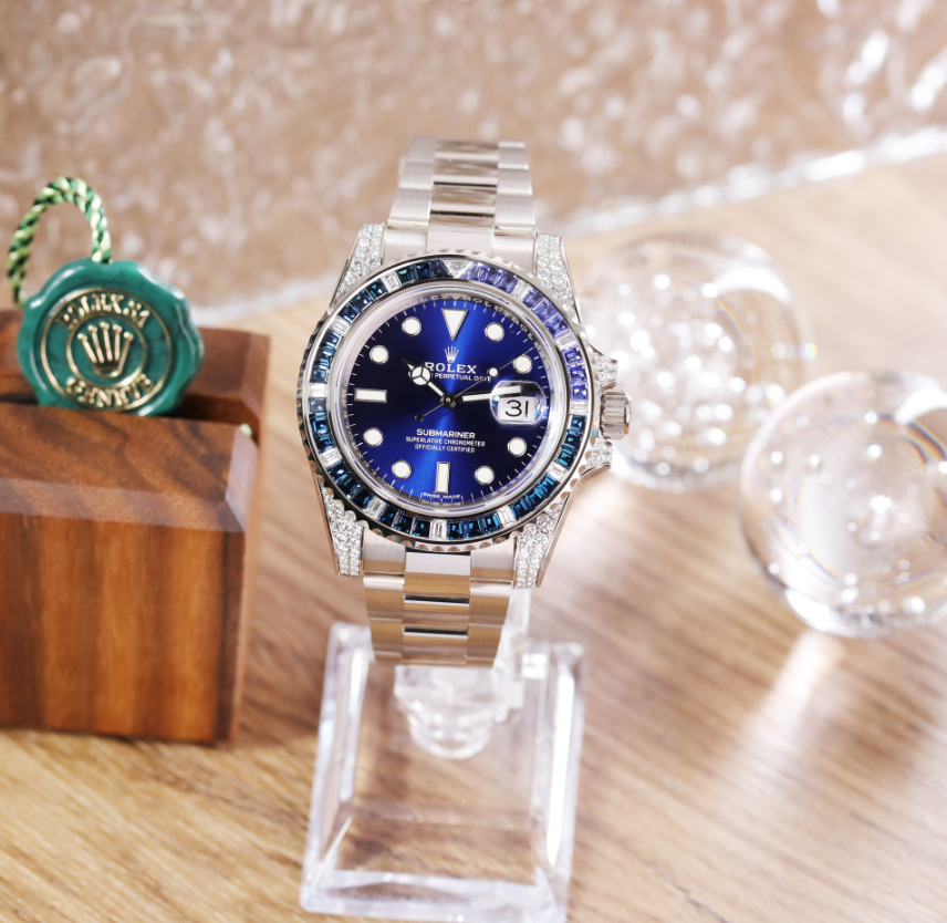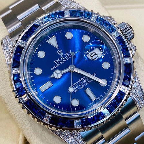 40mm 18K white gold case, screw-down back, end pieces and crown protector set with diamonds, screw-down crown with triplock triple waterproofness system, unidirectional rotating bezel set with sapphires and diamonds, scratch-resistant sapphire crystal with cyclops lens over the date, blue dial, Rolex calibre 3135 automatic movement with date at 3 o'clock, approximately 48 hours of power reserve, Oyster bracelet with flat three-piece links, Oysterlock folding safety buckle with Rolex glidelock extension system. Waterproof to 300 meters.